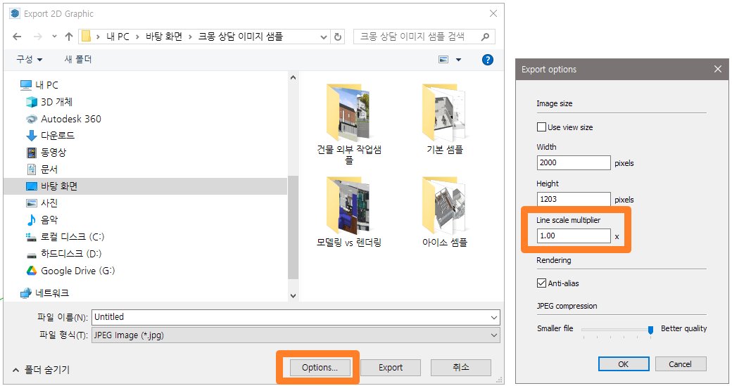 옵션을 조정하는 방법은 2D 내보내기 창에서 옵션창을 열어보면 이미지 사이즈와 선가중치 옵션을 조절할 수 있다. 이미지 사이즈의 경우 폭과 높이는 비율로 고정되어 있으니 둘 중 하나만 조정해도 된다.