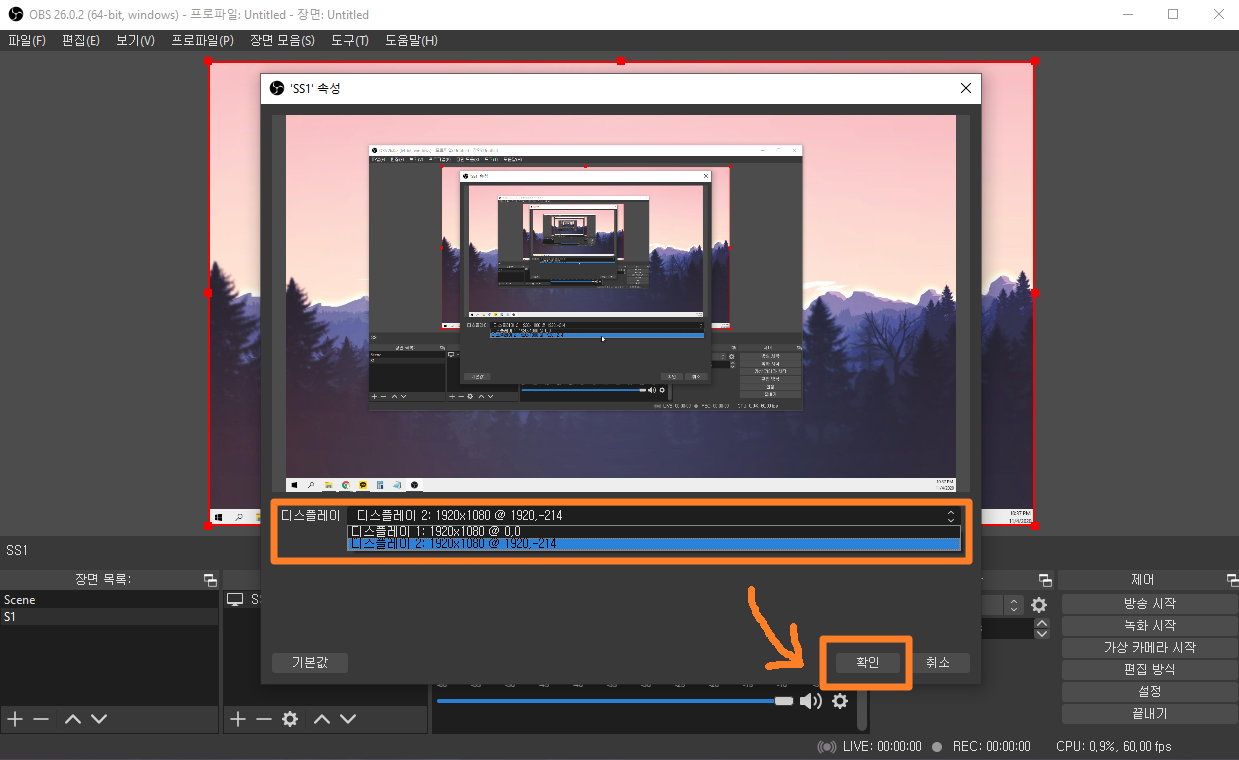이후에는 어떤 모니터를 녹화할 건지 설정해주는 창이 나옵니다. 모니터를 하나만 사용하시는 분은 바로 확인을 눌러주시면 되고, 듀얼 모니터를 사용하시는 경우에는 녹화할 모니터를 선택하신 후 확인 버튼을 눌러주시면 됩니다.