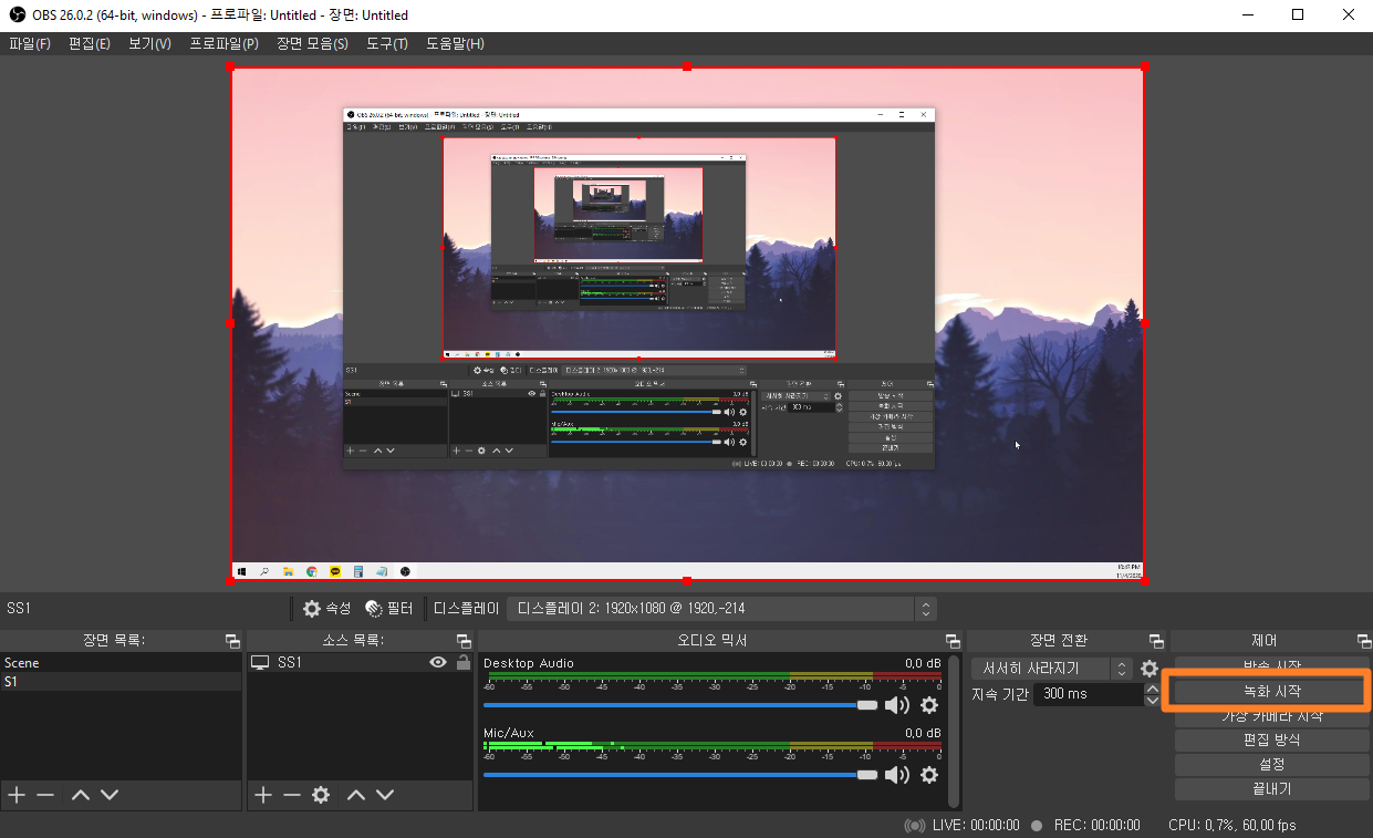 이제 모든 준비가 끝났습니다. 프로그램 우측 하단의 녹화 시작 버튼을 누르시면 버튼이 녹화중단으로 바뀌면서 녹화가 시작되고 녹화중단을 누르면 녹화된 화면이 mp4 파일로 저장됩니다. :)