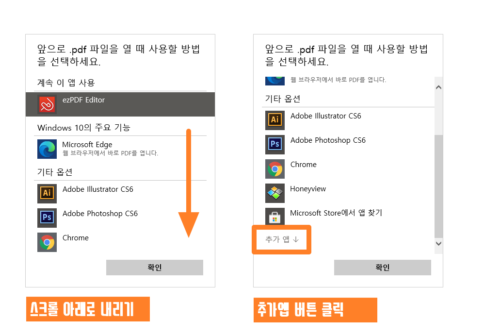 그러면 해당 확장자에 지정된 연결 프로그램이 상단에 뜨고 다른 연결 가능한 옵션들이 아래에 나옵니다. 혹시 원하는 프로그램이 기타 옵션에 뜨지 않는다면 스크롤을 내려서 추가 앱 버튼을 눌러주시면 다른 옵션들도 볼 수 있습니다. 여기서 원하는 연결 프로그램을 선택하고 확인 버튼을 눌러주시면 됩니다 :)
