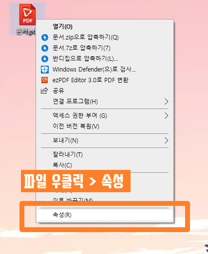열려고 하는 파일을 우클릭한 후 속성 버튼을 눌러줍니다.